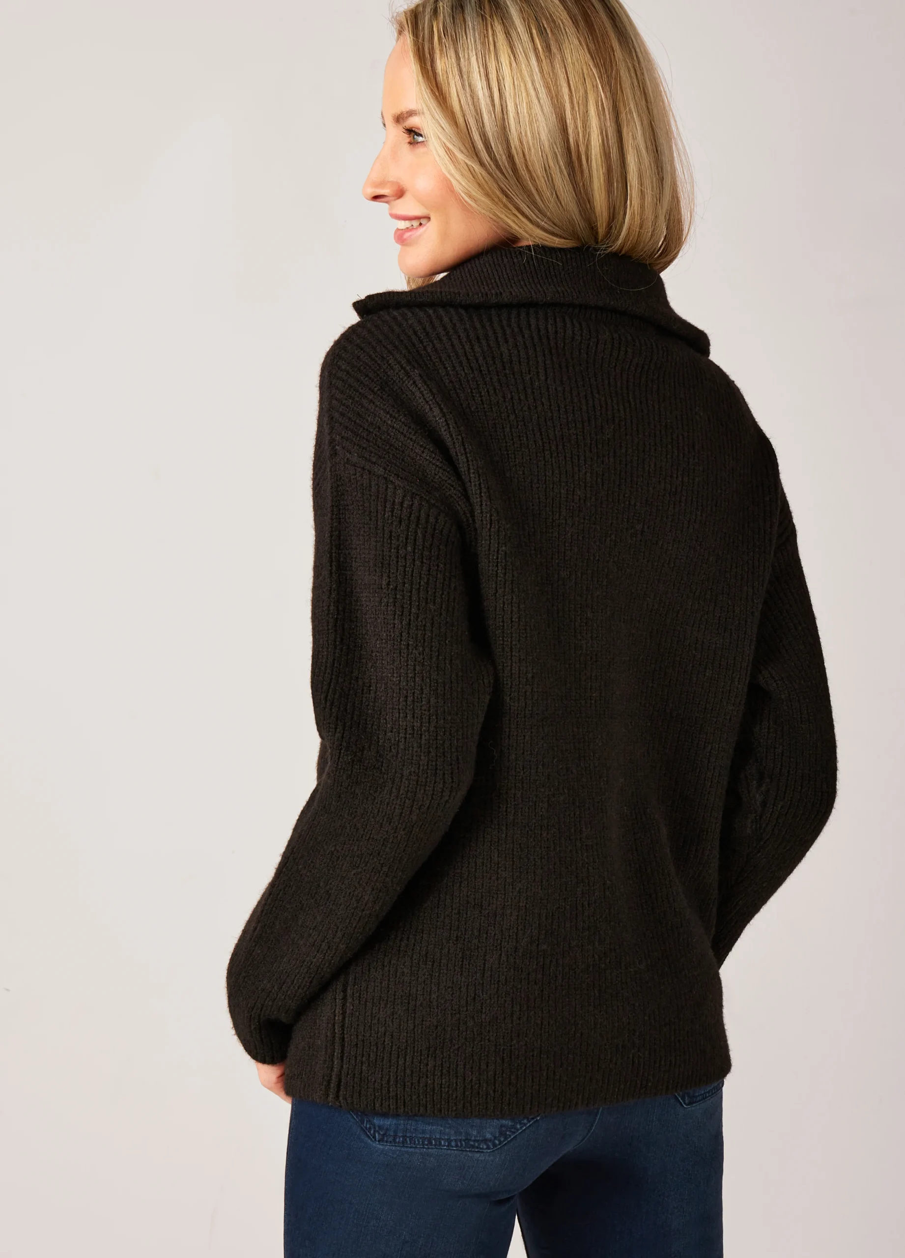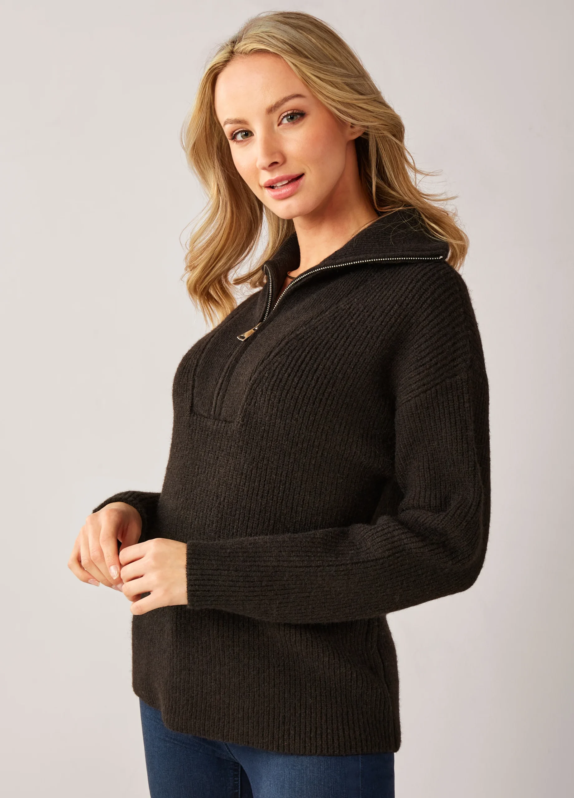 Ce pull noir en tricot à manches longues et col roulé à demi-zip est également disponible en gris-souris ou en beige. Il offre à la fois confort et style pour les journées fraîches.